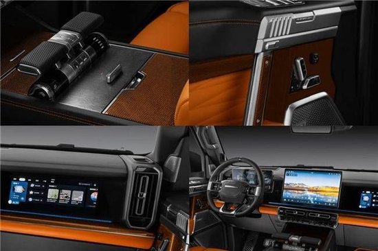 猛士M800星际战车提供莫兰迪绿、爱马仕橙两种内饰选择,并可接受多种内饰颜色及碳纤维饰板纹路定制。星际硬核战斗座舱搭配飞行器换挡手柄、烽火台式空调出风口、多屏联动智能交互、手枪式门把手设计,让驾驶舱极具战斗般的激情氛围。