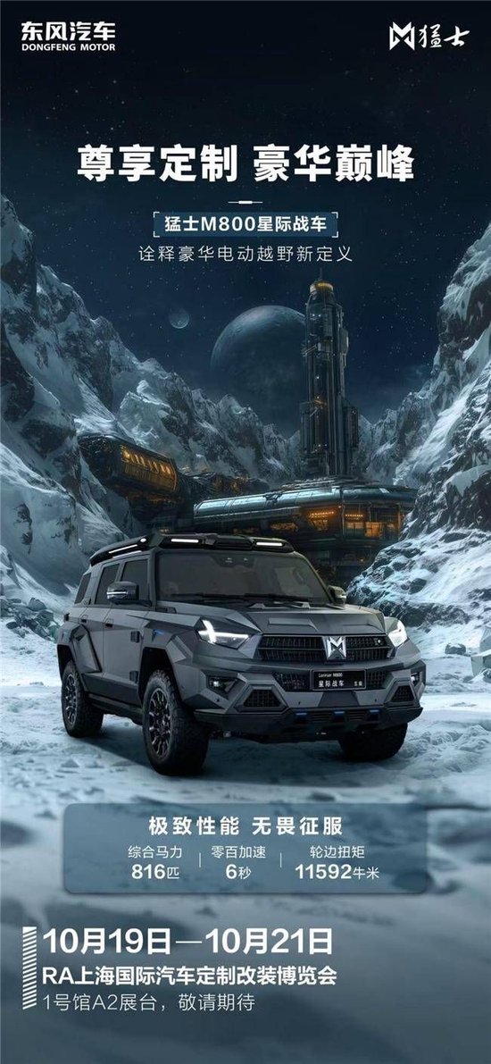 2024年10月19日-10月21日,第20届RA上海国际汽车定制改装博览会将于上海世博展览馆隆重开幕,由东风猛士(参数|询价)科技和罗伦士联手打造的东风猛士M800星际战车(参数|询价)届时将重磅亮相展会现场,引领广大消费者感受东方豪华电动越野的极致魅力,见证越野改装的更多可能。